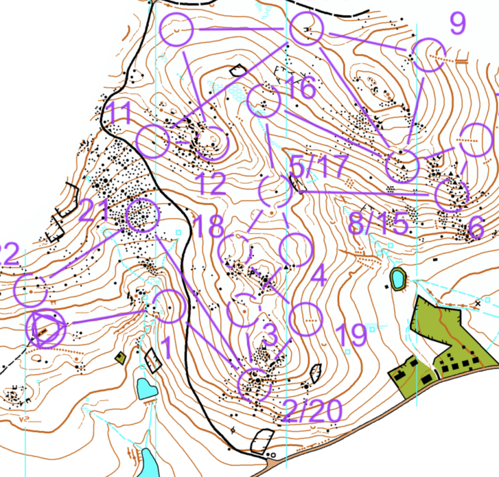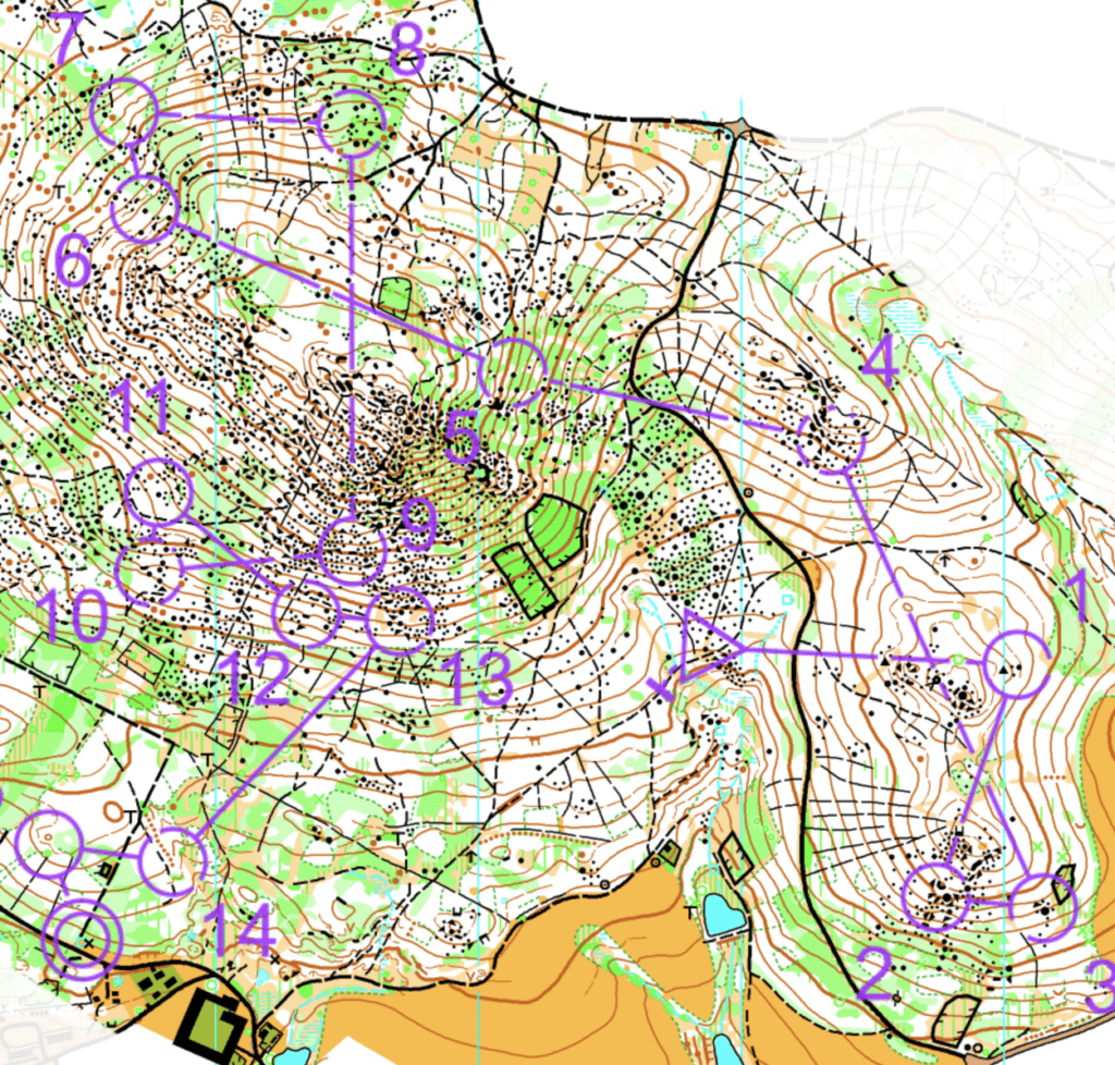 „Odpoledne po měřeném middlu jsme zase dali z vrcholu Kraví hory seběhovou trať krátkých postupů formou paměťáku. Tak jsme se donutili v tom celkem složitém lese hledat jednoduchá a zároveň robustní řešení, což je místy docela oříšek. Ale vyplatí se na tom pracovat. Pokud totiž nechceme v závodě ty nejtěžší situace řešit na náhodu, potřebujeme mít v tvorbě řešení nějakou vědomou rutinu. Zároveň je to i účinná analytická metoda – hledání řešení v určitém typu terénu nás upozorní na typické obtížné situace, a my si tak na ně dopředu můžeme připravit žádoucí reakce. V našem případě to například vedlo k diskuzi o tom co, a jestli vůbec něco, se dá vymyslet při náběhu šikmo kamenitým svahem.“