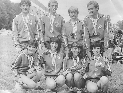 Stříbrná radost českých štafet na mistrovství světa 1983 v Maďarsku. Jaroslav Kačmarčík nahoře druhý zleva.